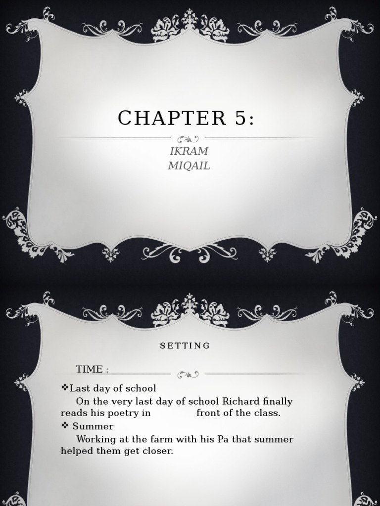 Moral values in chapter 1: Synopsis chapter 3 after a few weeks,mrs.hansen came to the class with a saddening news on how some irresponsible citizens harassed h. Dear mr.kilmer main events first main event in chapter 1, page 6, richard knight is a quiet, sensitive lad of fifteen is out deer hunting with his father and his elder brother, gus. This set is often saved in the same folder as. Read 16 reviews from the world's largest community for readers.