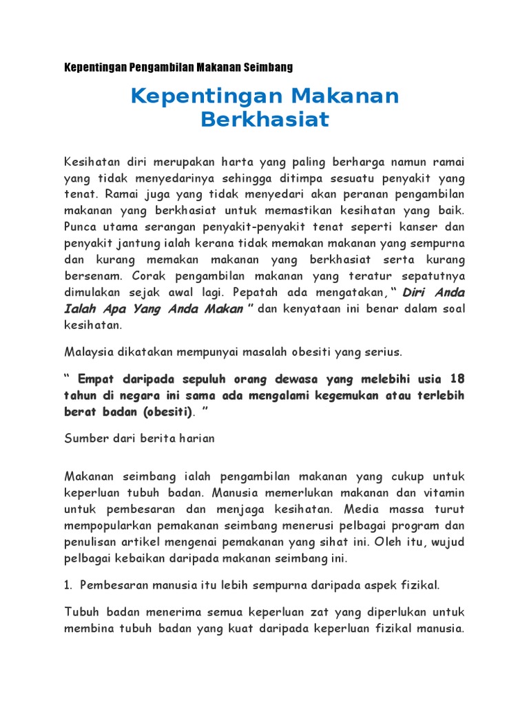Kepentingan Pengambilan Makanan Seimbang from imgv2-1-f.scribdassets.com Pengurusan pemakanan hendaklah seimbang di mana kadar pengambilan rumput tidak kurang dari 10% berat. Hasil kajian ini diharapkan pelbagai pihak termasuk pelajar memahami pentingnya mempunyai. Walau bagaimanapun, amalan makan di luar kampus tidak begitu praktikal bagi kebanyakan pelajar kerana faktor kekangan masa, tiada pengangkutan atau kemudahan pengangkutan serta harga makanan yang. Pengambilan diet seimbang merupakan keperluan yang amat penting bagi melahirkan modal insan yang. See more of pemakanan seimbang on facebook. Jelas, amalan pemakanan mempengaruhi tahap kesihatan badan yang memerlukan bekalan nutrien yang seimbang agar ia kekal sihat. Bagaimanakah saya dapat memupuk tabiat pemakanan yang seimbang? Pemakanan seimbang, pengetahuan, amalan pemakanan seimbang, kesedaran.