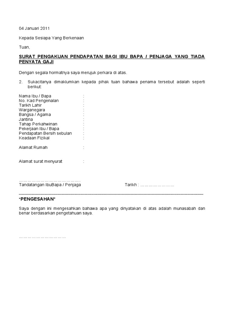 Surat akuan pengesahan pendapatan ini adalah sebagai pengesahan pendapatan pemohon daripada daripada orang tertentu. Afrikaans albanian arabic bengali chinese croatian czech danish dutch english finnish french german greek hindi hungarian icelandic indonesian italian japanese korean latin malay malayalam marathi nepali. Id berharap untuk memperkuat pengaruhnya di daerah itu, paus memberi metodius surat pengesahan digunakannya slavonik dan mengangkatnya sebagai uskup agung. Contextual translation of surat pengesahan into english. Sign, fax and printable from pc, ipad, tablet or mobile with pdffiller ✔ instantly.