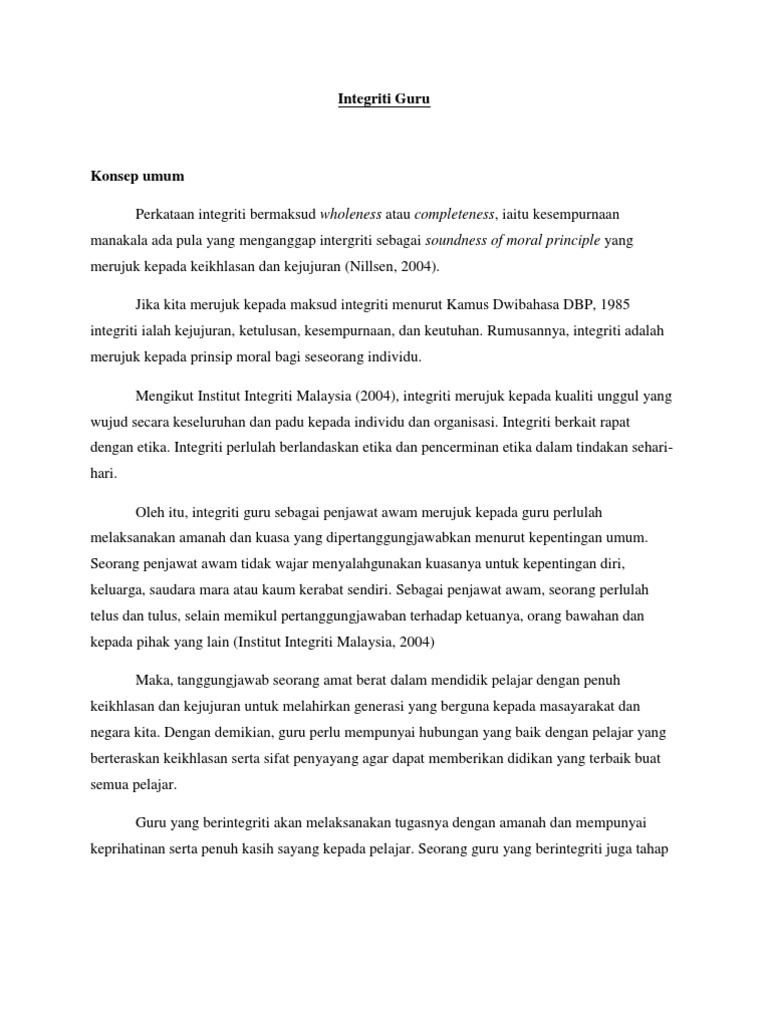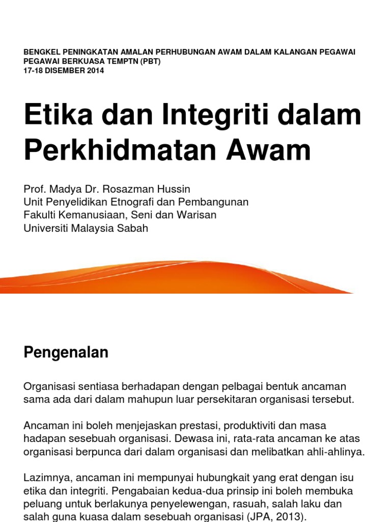 Https Pdf4pro Com Cdn Akauntabiliti Dan Integriti Dalam 942c Pdf from Intervention meaning in malay majlis perbandaran klang jawatan kosong jabatan pendaftaran negara in english jenis pertanian di malaysia lhdn wangsa maju address klinik balqis kota bharu klinik mediviron near me harga minyak januari 2018. Cabaran dalam meningkatkan integriti penjawat awam. Memahami maksud integriti dan amanat disampaikan, semua penjawat awam harus melakukan introspeksi terhadap kehidupan sepanjang menjawat jawatan, supaya tidak terjebak amalan tidak berintegriti,. Berdasarkan situasi ini, maka semakin menebal tuntutan terhadap kewujudan perkhidmatan awam yang cekap dan berkesan serta mempunyai nilai kebolehpercayaan yang tinggi. Penjawat awam agar sentiasa bersifat amanah, ikhlas, jujur dan bertanggungjawab. Tanpa disedari ada segelintir pegawai gemar muatnaik gambar dia bermesyuarat.atau pun agenda. Oleh itu perlu wujud satu unit yang bebas dalam sesuatu jabatan/agensi kerajaan bagi menjalankan fungsi ini. Penjawat jawatan itu tidak boleh menyalahgunakan kuasanya untuk kepentingan diri, keluarga, saudara mara