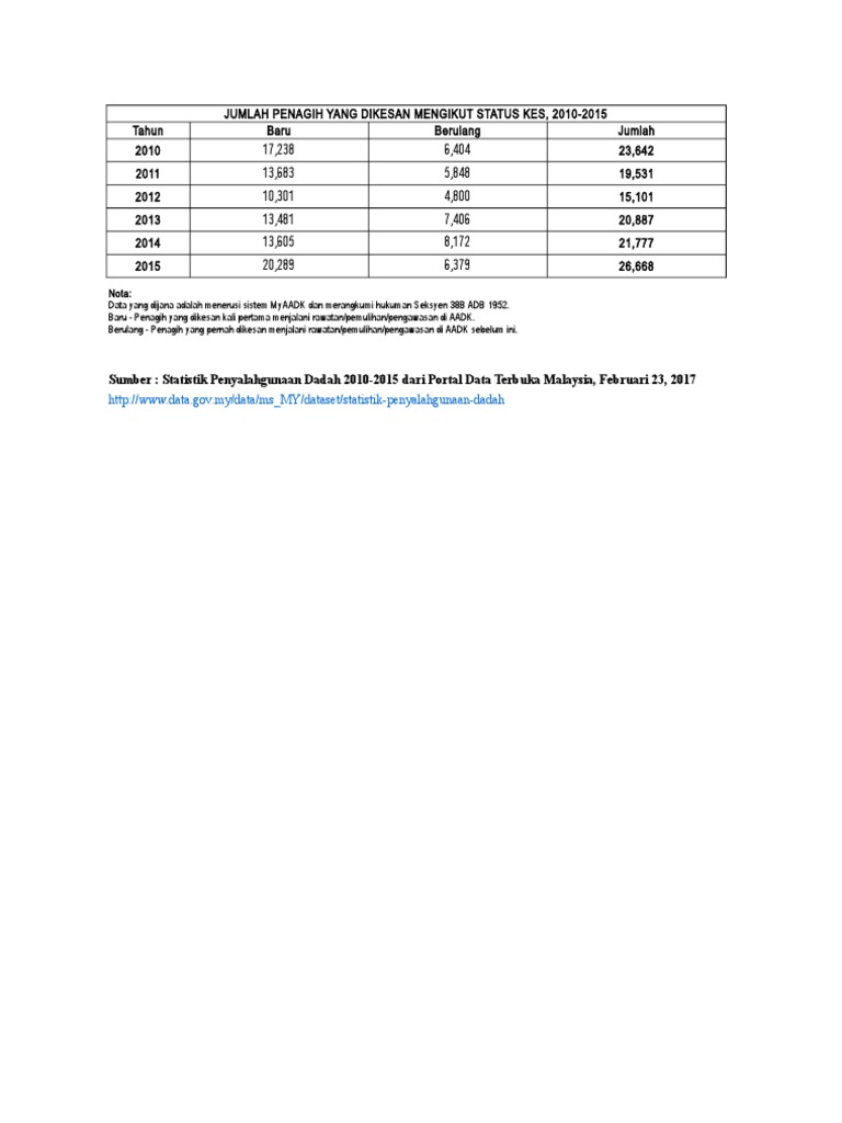 Taburan penagih dadah di malaysia pada tahun 2012. Selain itu, katanya statistik menunjukkan peningkatan penagih baharu kepada 22,925 kes berbanding 20,281 kes dalam. Statistik penagih dadah di malaysia. Menurut statistik, kebanyakan penagih dadah jenis lain bermula dengan dadah jenis ganja terlebih dahulu. You'll get plenty of warnings related to dadah when you visited malaysia.